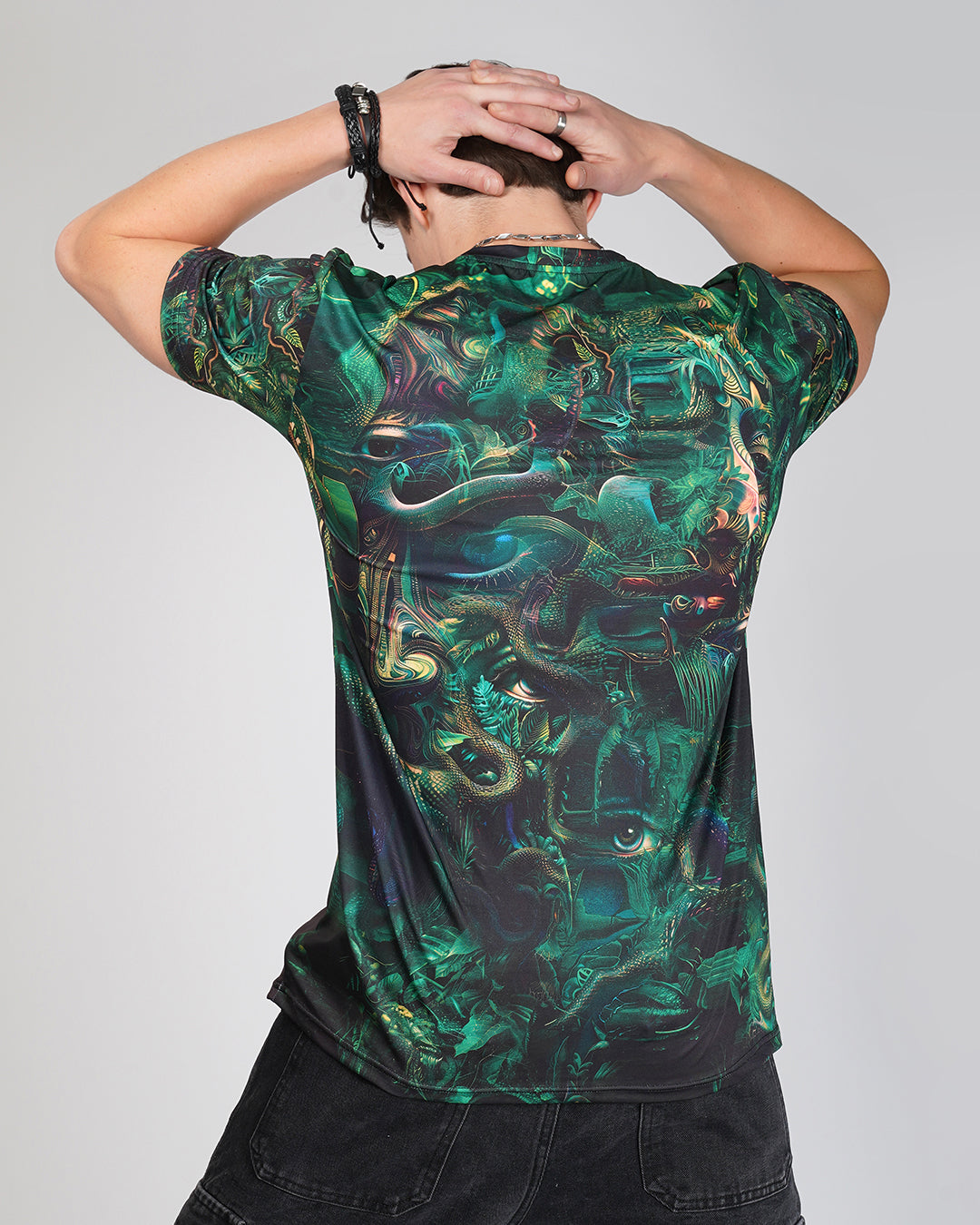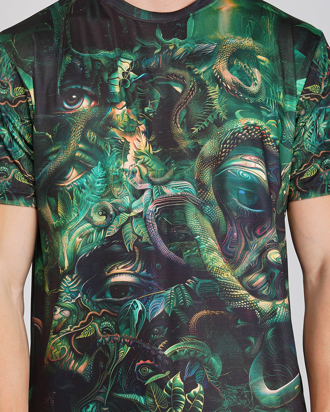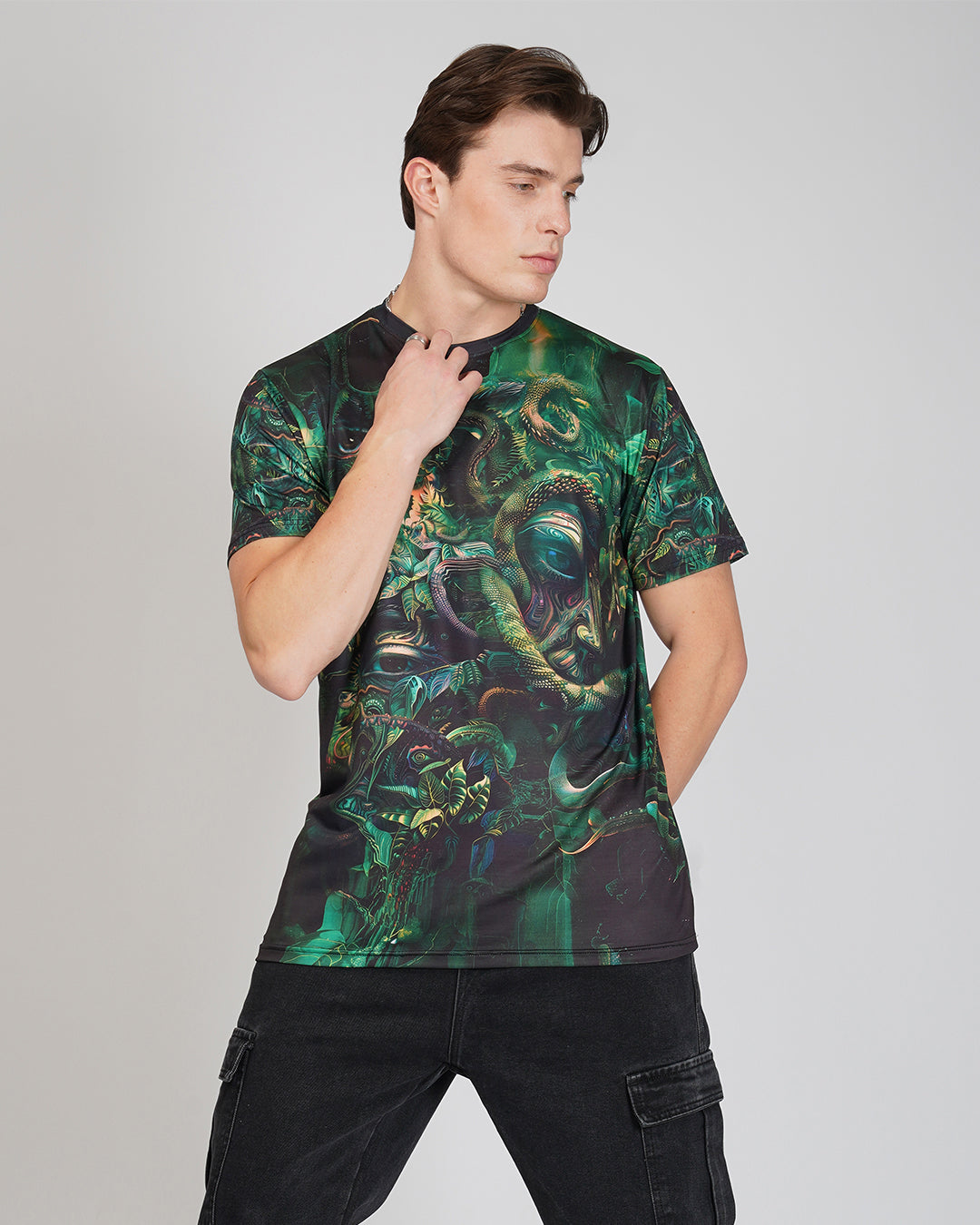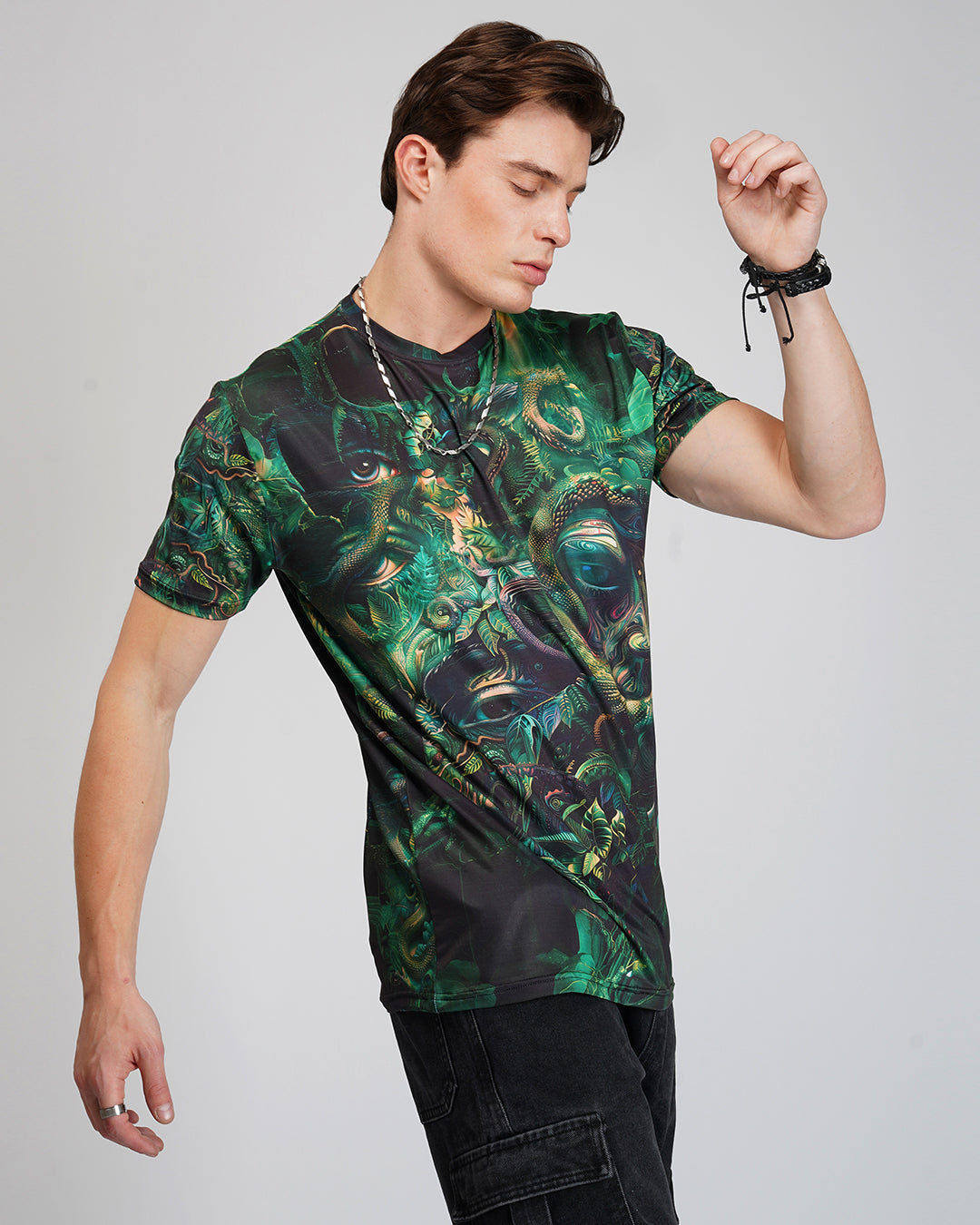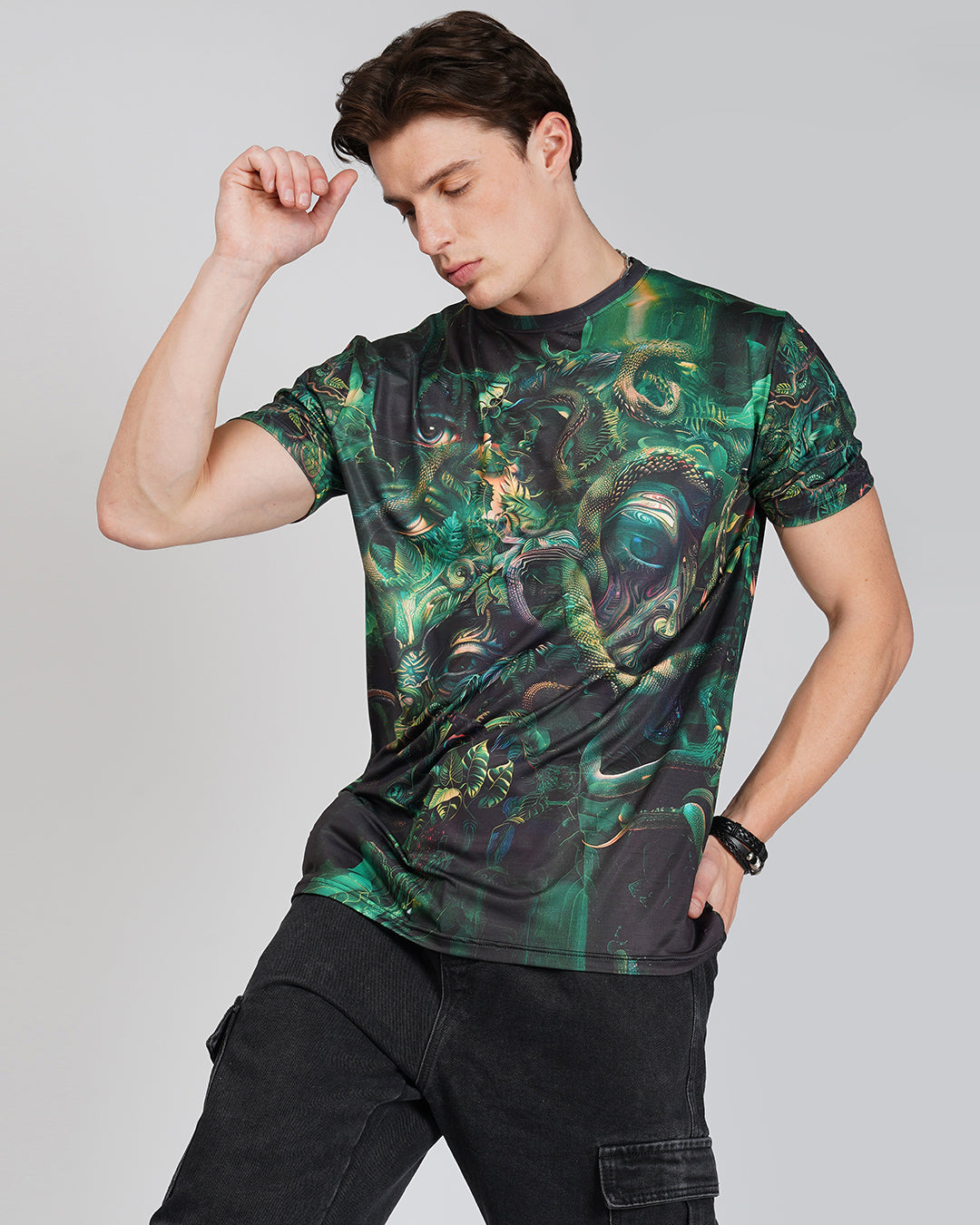 חולצת טי מודפסת דיגיטלית בעיצוב ייחודי, עם מפתח צוואר עגול וגזרה רגילה.