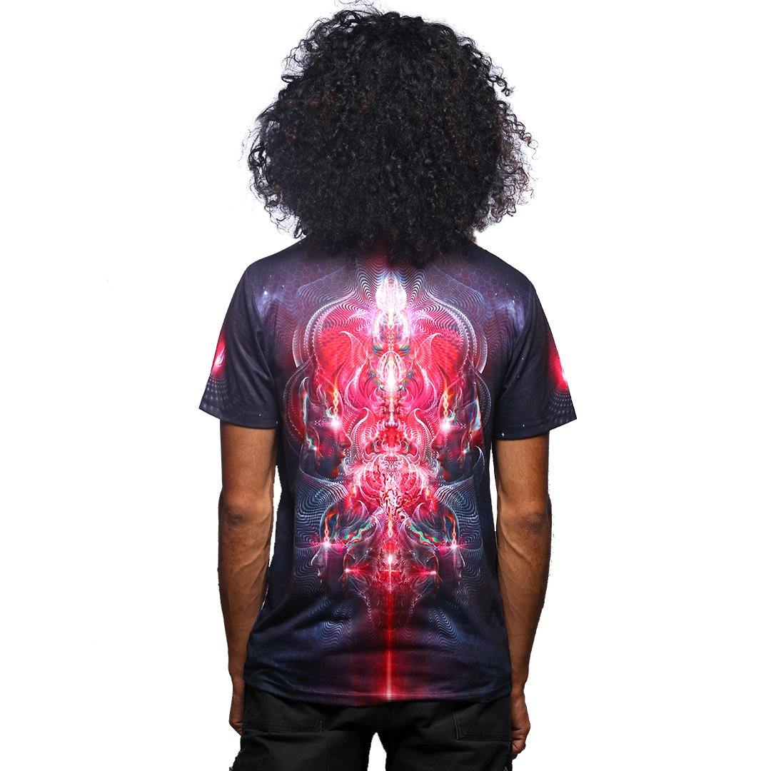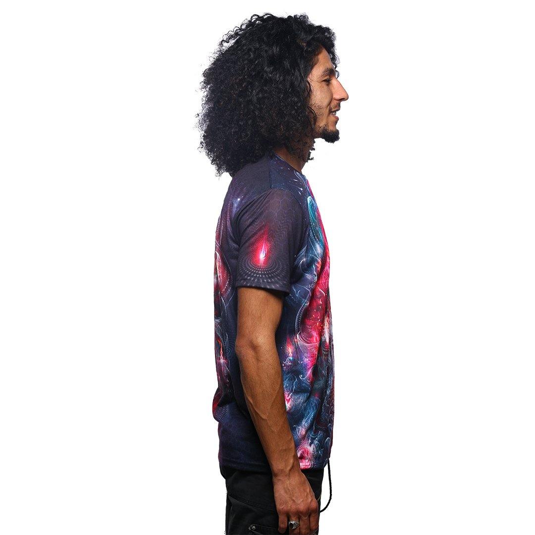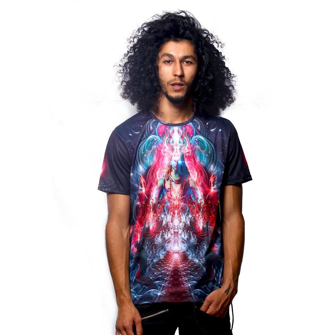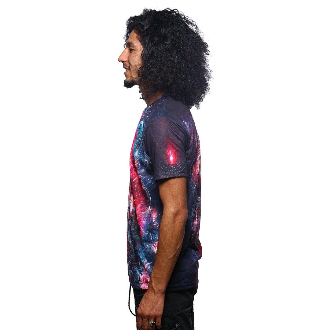 חולצת טי מודפסת דיגיטלית בעיצוב ייחודי, עם מפתח צוואר עגול וגזרה רגילה.