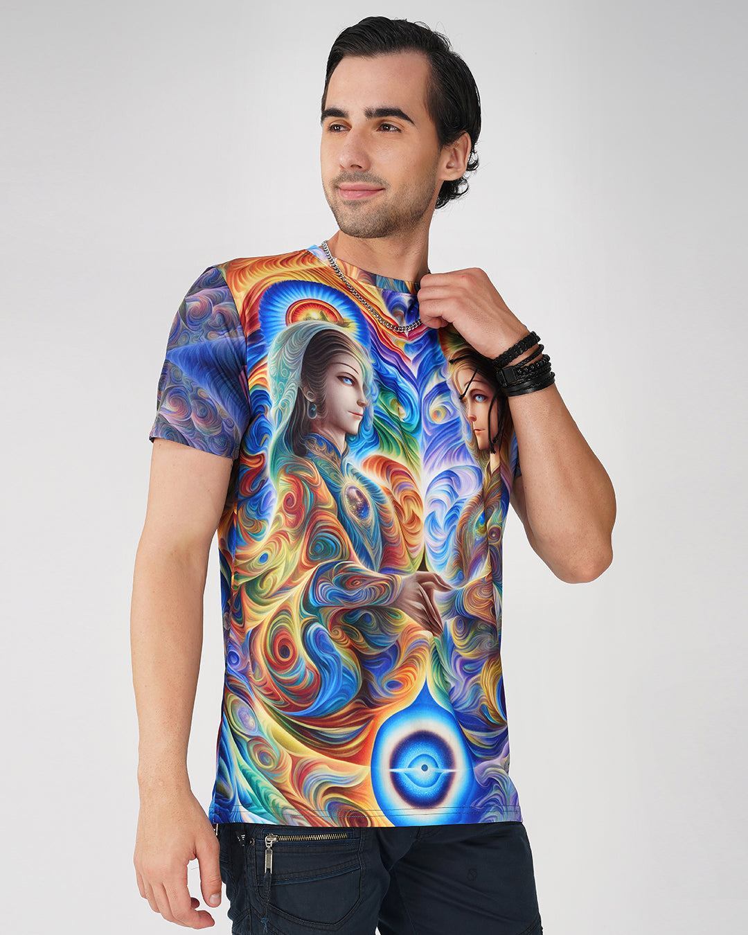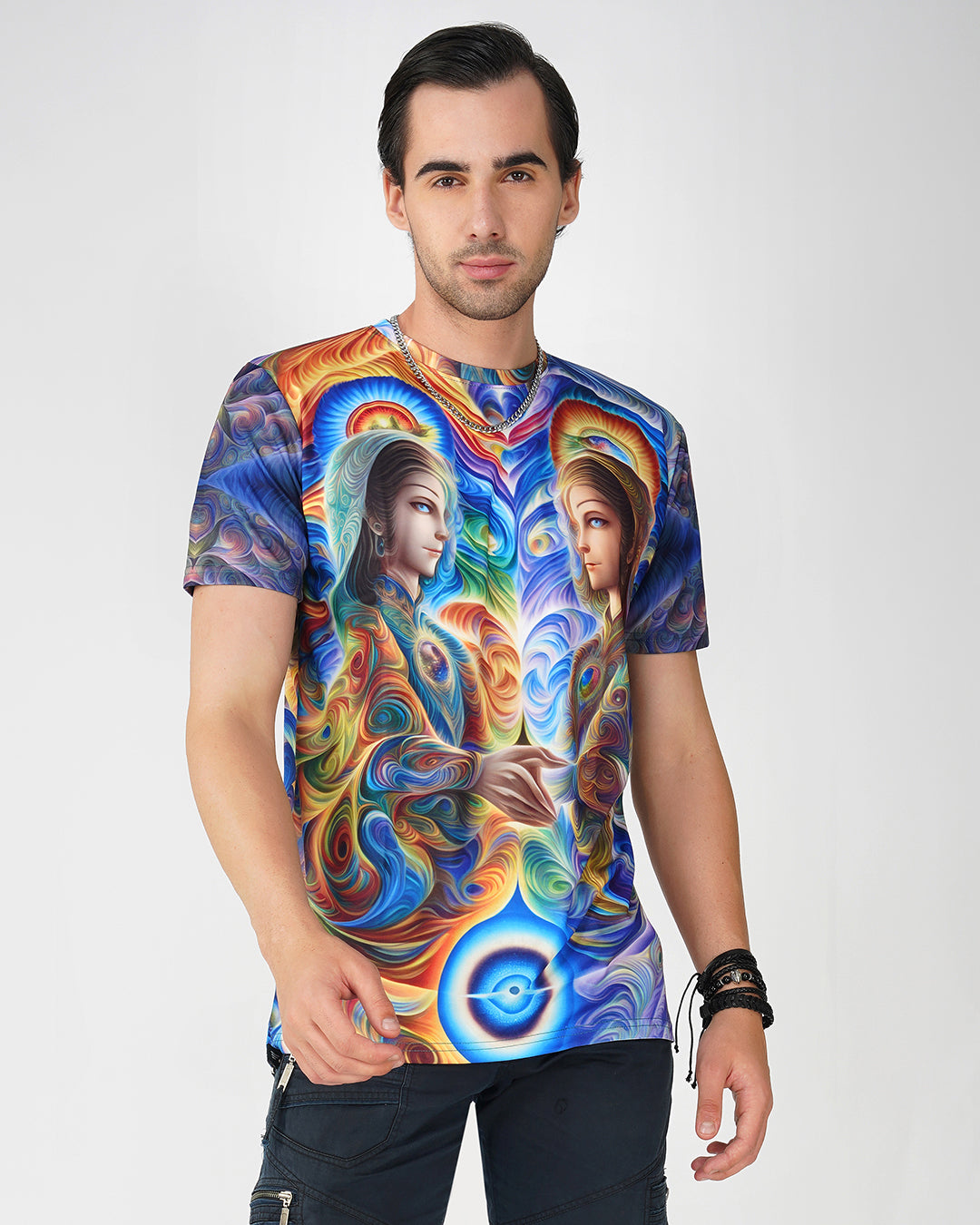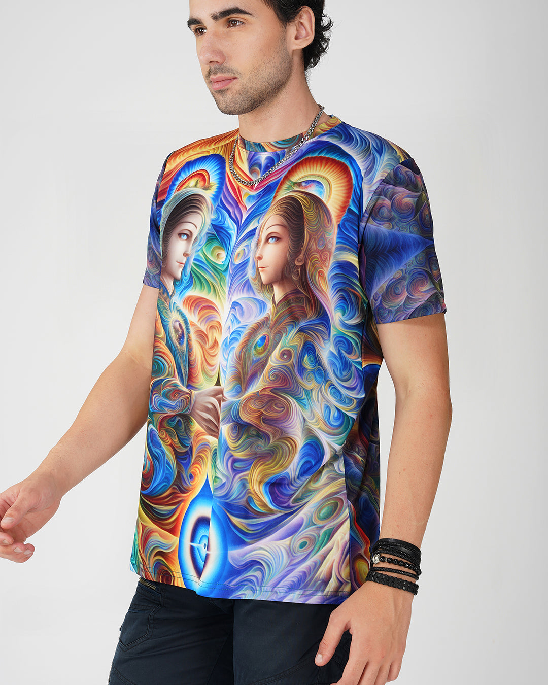 חולצת טי מודפסת דיגיטלית בעיצוב ייחודי, עם מפתח צוואר עגול וגזרה רגילה.