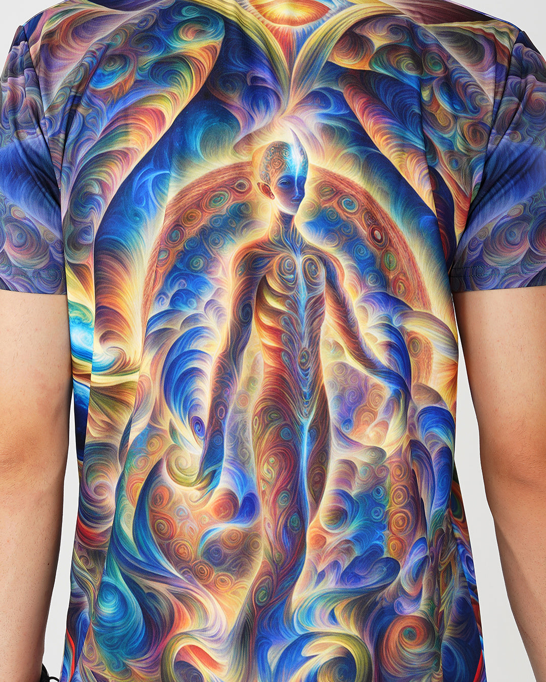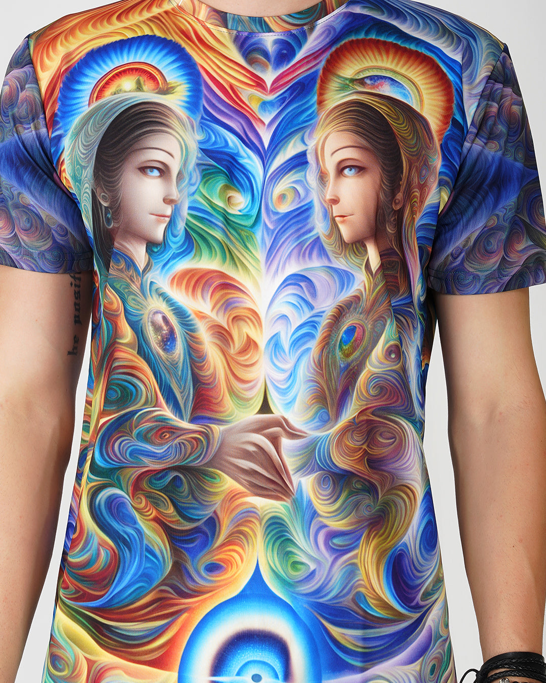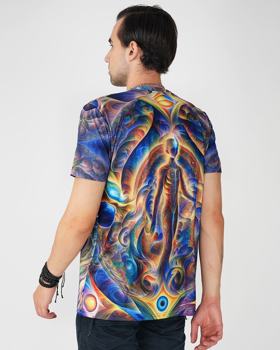 חולצת טי מודפסת דיגיטלית בעיצוב ייחודי, עם מפתח צוואר עגול וגזרה רגילה.